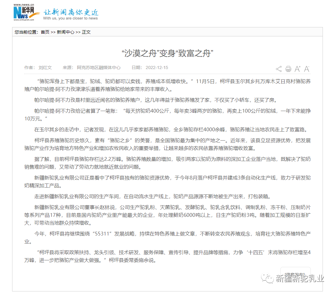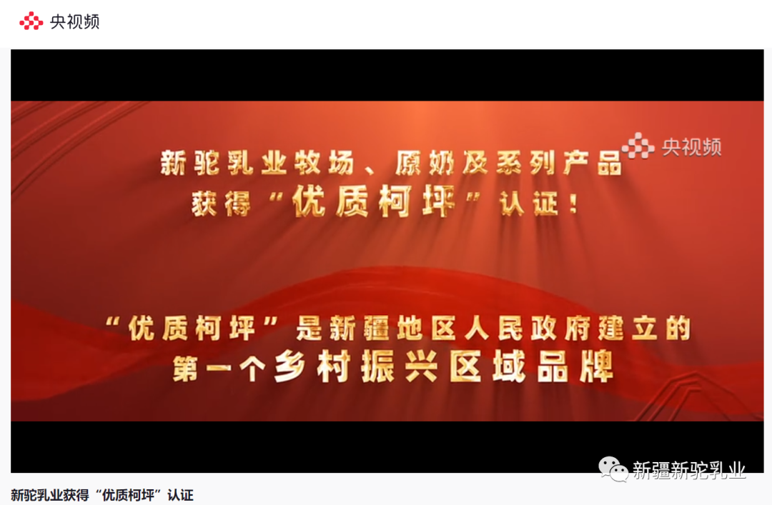 近日、新疆衛(wèi)視漢語、新疆二套維吾爾語、三套哈薩克語并機(jī)直播的《新疆新聞聯(lián)播》、中央廣播電視總臺央視頻、新華網(wǎng)等主流媒體,紛紛對新駝乳業(yè)獲得“優(yōu)質(zhì)柯坪”認(rèn)證(這是新疆地區(qū)人民政府建立的第一個鄉(xiāng)村振興區(qū)域品牌)進(jìn)行報道,熱度持續(xù)上升!